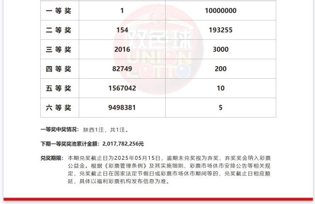 奖金1000万元!双色球开出1注一等奖 单注万万年